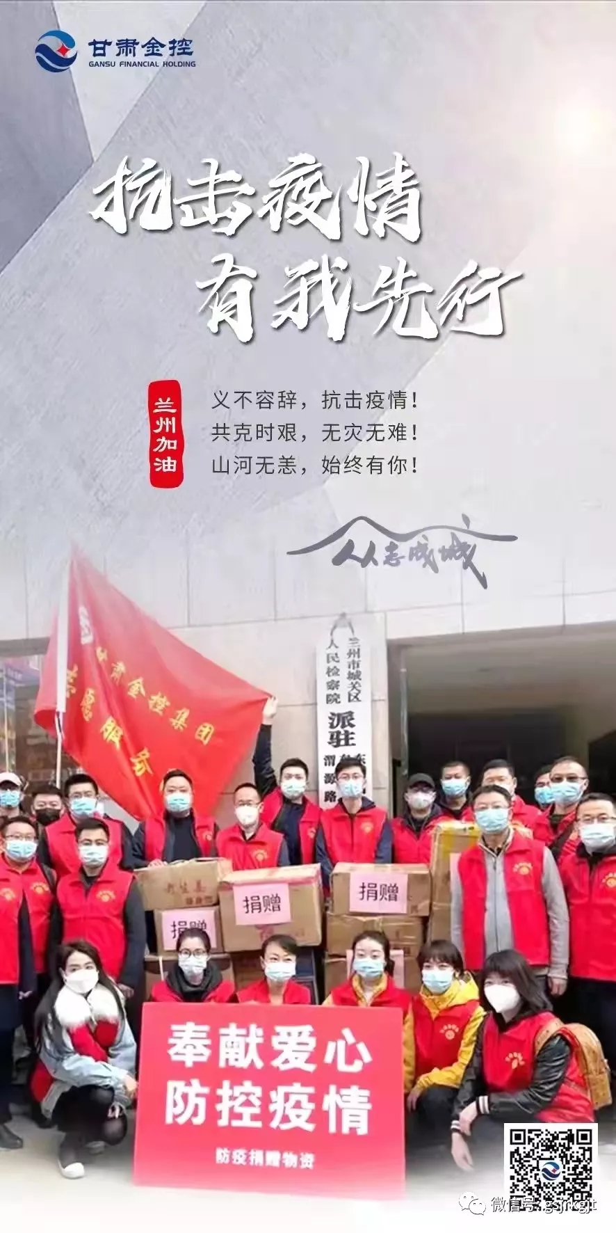 十月的金城,还没来得及走出国庆的喜悦,突袭而至的“德尔塔”病毒让整个城市按下了“暂停键”,车水马龙的兰州市显得格外静寂,美丽的黄河之滨也略失姿色,唯有满城鲜红的党旗给人以信念,白衣铠甲的逆行者给人以信心,“兰州加油、抗疫必胜”的强音不断响彻金城大地。十月“抗疫之战”打响以来,全省各行各业主动扛起责任,医护人员昼夜奋战、公安民警奋勇当先,国企勇挑重担,民企积极出力,科研人员奋力攻关,党员干部投身志愿一线,全城的每一个人都在竭尽全力为抗疫贡献自己的一份力量,共同描绘着一幅同舟共济的抗疫画卷。陇原融资租赁公司就是这其中的一支队伍,在九游平台党委的坚强领导下,全体员工积极服从疫情防控大局需要,全力夯实金融支持疫情防控坚强后盾,主动投身疫情防控的严峻斗争中。